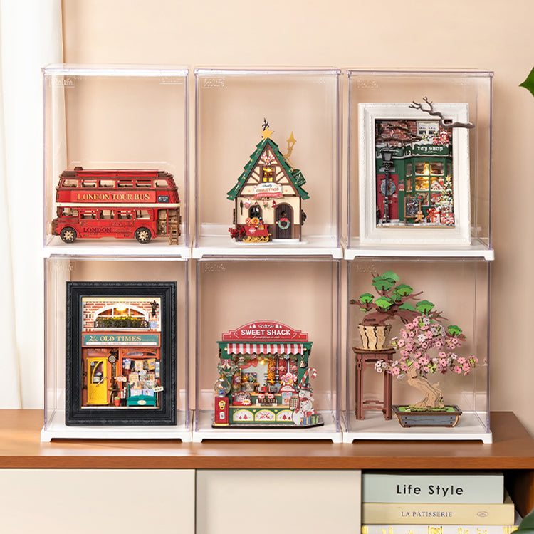 La vitrine est fabriquée en acrylique transparent et dispose d’une base en matière synthétique blanc qui met très bien en valeur votre modèle. En plus de l’apparence professionnelle, la vitrine protège la miniature de la poussière et des dommages. Cela signifie moins d’entretien et beaucoup plus de plaisir. Ces vitrines Rolife sont compatibles avec de nombreux modèles Robotime tels que le Sakura Bonsai ou le Pine Bonsai, mais aussi votre collection Nanci's Sweet Time y est parfaitement présentée.