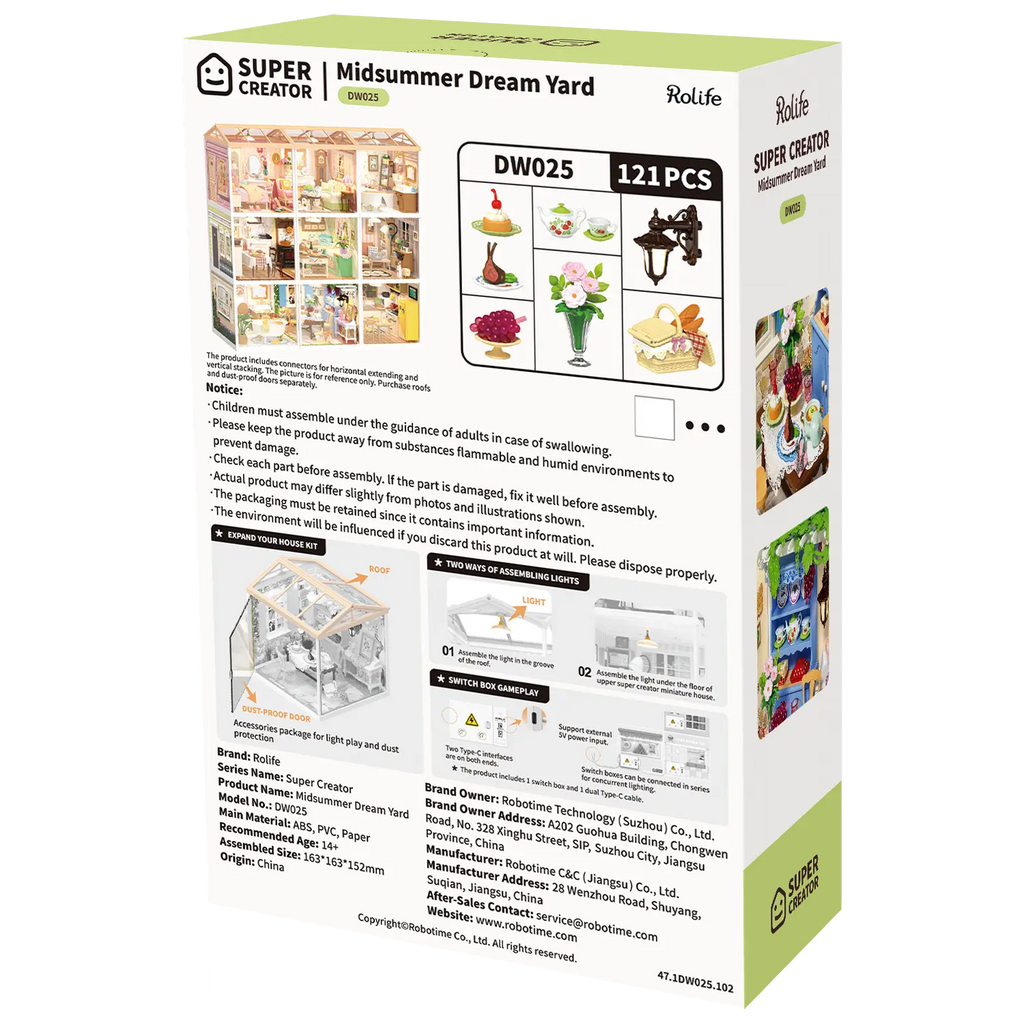Vous avez envie de plonger dans une pure romance au format miniature ? Le Rolife Midsummer Dream Yard vous transporte aussitôt vers une cour intérieure baignée de soleil, quelque part en France, où vous auriez presque envie de retirer vos chaussures. Vous vous imaginez déjà vous installer sous une pergola couverte de grappes de raisin qui semblent tomber directement dans votre verre ? La table extérieure est dressée avec élégance : une coupe de raisins, un bouquet de roses roses et des verres à vin scintillants. Le long du mur se tient une armoire bleu ciel remplie de jolie vaisselle à motifs de petites cerises – avouez que vous la voudriez en taille réelle ! Ce décor n’attend plus que votre touche créative.