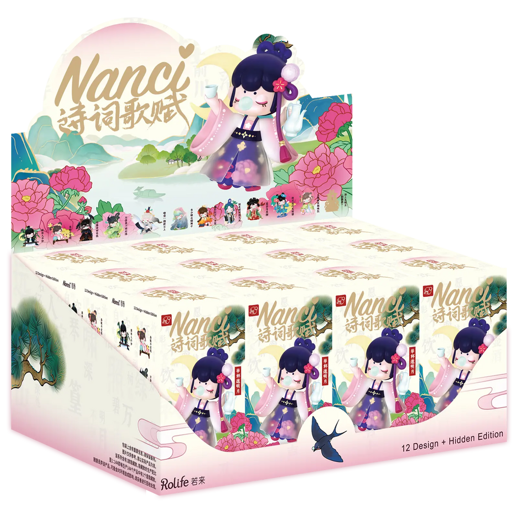 Nanci voyage à travers des poèmes anciens et fait revivre la romance du passé dans une version moderne et ludique. Nanci est une petite fille cachée dans une boîte surprise. Chaque boîte renferme une figurine Nanci, et vous ne saurez qui vous recevrez qu’en ouvrant la boîte. Sur la boîte, Nanci est toujours représentée avec la lune, une tasse et un pichet, mais à l’intérieur, il peut s’agir d’une Nanci aux cheveux vert clair marchant sous la pluie avec une cape transparente, ou d’une Nanci tenant des fleurs de cerisier dans ses mains.
