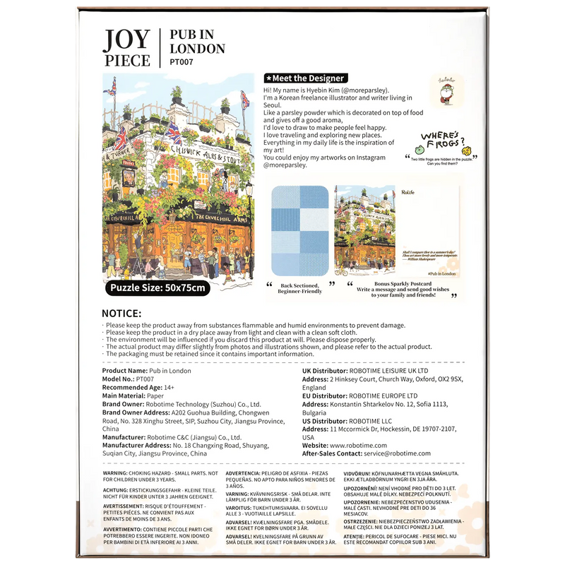 Car à cette adresse se trouve le pub Churchill Arms. L’intérieur est décoré de souvenirs de Winston Churchill et de la Seconde Guerre mondiale. L’extérieur est typique d’un pub du quartier de Kensington. Les maisons environnantes, principalement blanches, possèdent de magnifiques façades anciennes avec de petites fenêtres. L’artiste coréenne Kim Heybin a représenté cette scène de manière unique dans son style. Le café est rempli de clients dégustant un repas rapide. À l’extérieur, des gens discutent et partagent une pinte. Tous ces détails vous guideront dans l’assemblage de votre puzzle.