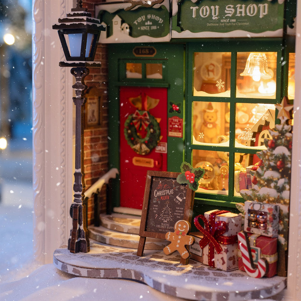 Qui ne le voudrait pas ? Ces véritables soirées d’hiver d’autrefois, remplies de chaleur et de douceur, où le parfum des sapins et du chocolat chaud flotte dans l’air pendant que la neige tombe doucement dehors. Dans votre manteau bien chaud, vous marchez dans une ruelle illuminée par des guirlandes festives, et au bout se trouve une adorable boutique de jouets. La façade verte respire l’esprit de Noël, la porte rouge est décorée d’une couronne et d’un ruban. Dans les petites fenêtres, une lumière scintille doucement, et dans la vitrine, un ours en peluche et des paquets cadeaux vous transportent en enfance…