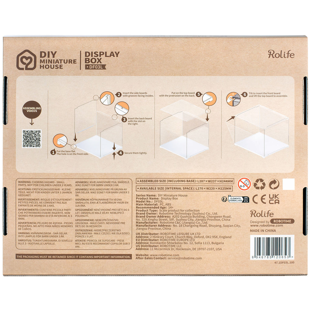 Uiteraard hebben we het over vitrines. De meest veilige manier om jouw pareltjes veilig te houden. En het mooie is, we hebben een stapelbare display case. Dat betekent dat je een heuse toren kunt bouwen en zo ruimte bespaart. Bovendien kun je je hele collectie netjes boven op elkaar uitstallen, in plaats van dat je overal losse stukken hebt staan. Je bouwt deze stofkap zelf. De vijf perspex panelen van de display case klik je eenvoudig in elkaar zoals altijd bij Robotime met nokken die in inhammen passen. Plaats je miniatuur op de witte kunststof bodem en zet de kap eroverheen. Super eenvoudig!
