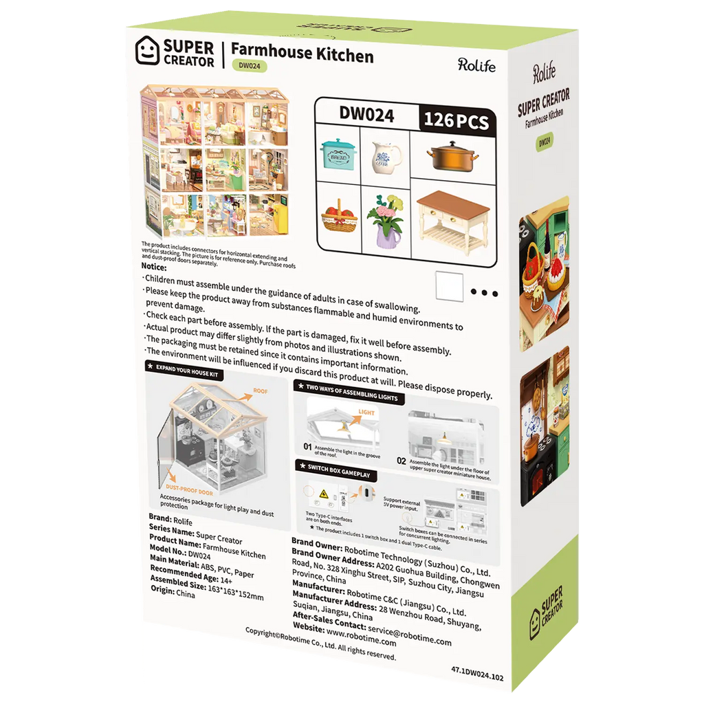 Deze kunststof bouwset maak je in een paar uur. Je hoeft niet te knippen, zagen of lijmen. Alles is al op kleur en is van makkelijk te onderhouden materiaal. Je krijgt plakrondjes voor eventueel de voorwerpen vast te plakken. Na voltooiing meet jouw keuken in de breedte en diepte 16,3 centimeter en is hij 15,2 hoog. Hij heeft een schaal van 1:24 waardoor alle voorwerpen in de goede verhouding staan. Zelfs de bloemen en de overheerlijke taarten kloppen. Je kunt dit miniatuurkamertje stapelen op andere bouwsets van de serie om een poppenhuis te maken.