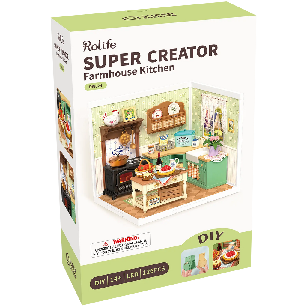 Rolife heeft het weer voor elkaar. Een schattig miniatuurkeukentje waar een groen keukenblok met witte aanrecht het hart vormt. Gordijnen voor de ramen laten zacht zonlicht naar binnen vallen en accentueren de warme sfeer. Een turquoise broodblik staat naast een potje suiker, terwijl een doos met cookies uitnodigt tot stiekem snoepen. De bruine tegelvloer en het bloemetjesbehang maken het geheel compleet en brengen een authentieke, nostalgische uitstraling die je meteen doet glimlachen. Ondanks dat het supergedetailleerd is, kan iedereen dit bouwen. Lees snel verder!