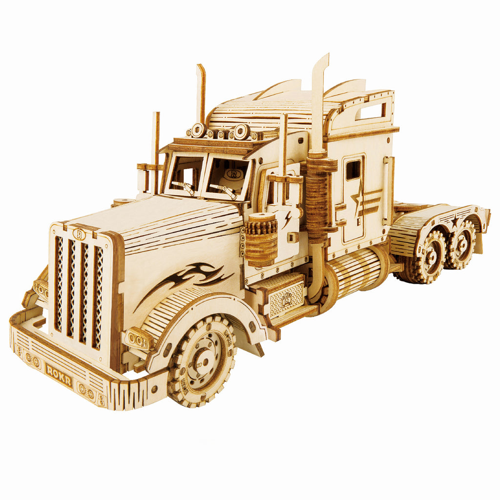 Jij doet aan modelbouw of wilt ermee beginnen? Dit duurzame, houten bouwpakket van ROKR is een geweldige starter om de smaak van de hobby te pakken te krijgen. Of voeg hem toe aan je collectie. Dit statische model van een moderne Amerikaanse truck heeft een verhouding van 1:40. De stoere neus spreekt boekdelen met de gebogen bumper en vlammende special paint boven de wielkasten. De cabine heeft ruitenwissers, verstralers bovenop, vette uitlaten langszij en grote spiegels. Ook binnenin is aan alles gedacht, het dashboard heeft metertjes en de stoelen hebben zelfs de ROKR-'R' in de hoofdsteunen. En hoewel de wielen niet draaien, heeft jouw vrachtwagen wel bewegende delen. Zo kunnen de portieren van de cabine open, zo ook de deur van de slaapcabine en de koppelschotel voor de oplegger kan kantelen.