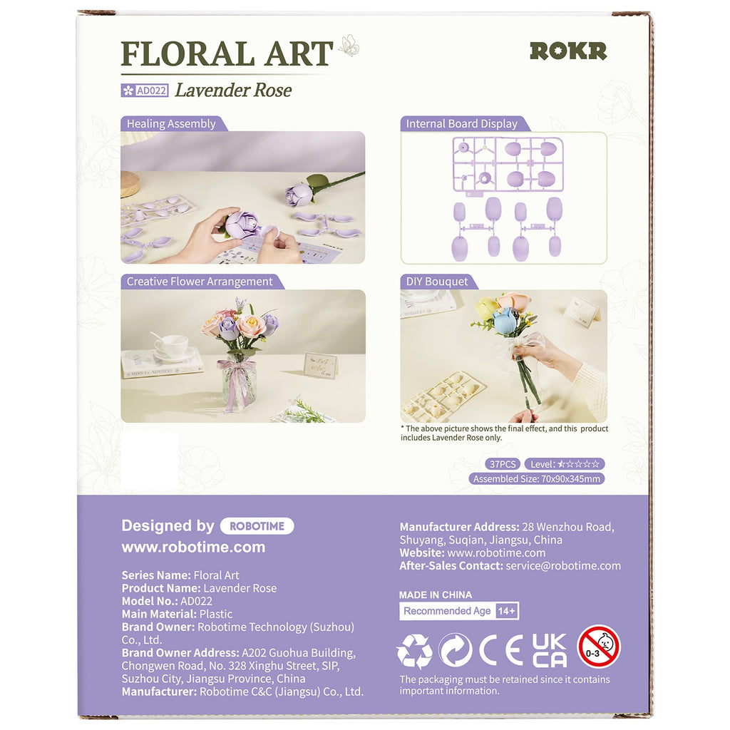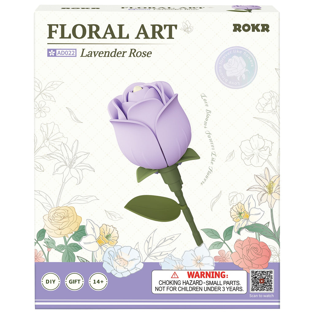 Met het bouwpakket van ROKR maak jij zelf dit kunstwerk. Uit de kunststof frames knip je de 37 onderdelen, die je zonder lijm of gereedschap in elkaar klikt. Elk onderdeel past perfect met een pinnetje in het gaatje van een ander onderdeel, elke vorm is doordacht. Het is een prima bouwset voor beginners, want we kennen dit bouwpakket een halve ster toe. Zo bouw je in ongeveer 30 minuten jouw eigen lavendelroos van bijna 35 centimeter hoog. Of korter, als je liever speelt met hoogteverschillen in je boeket.