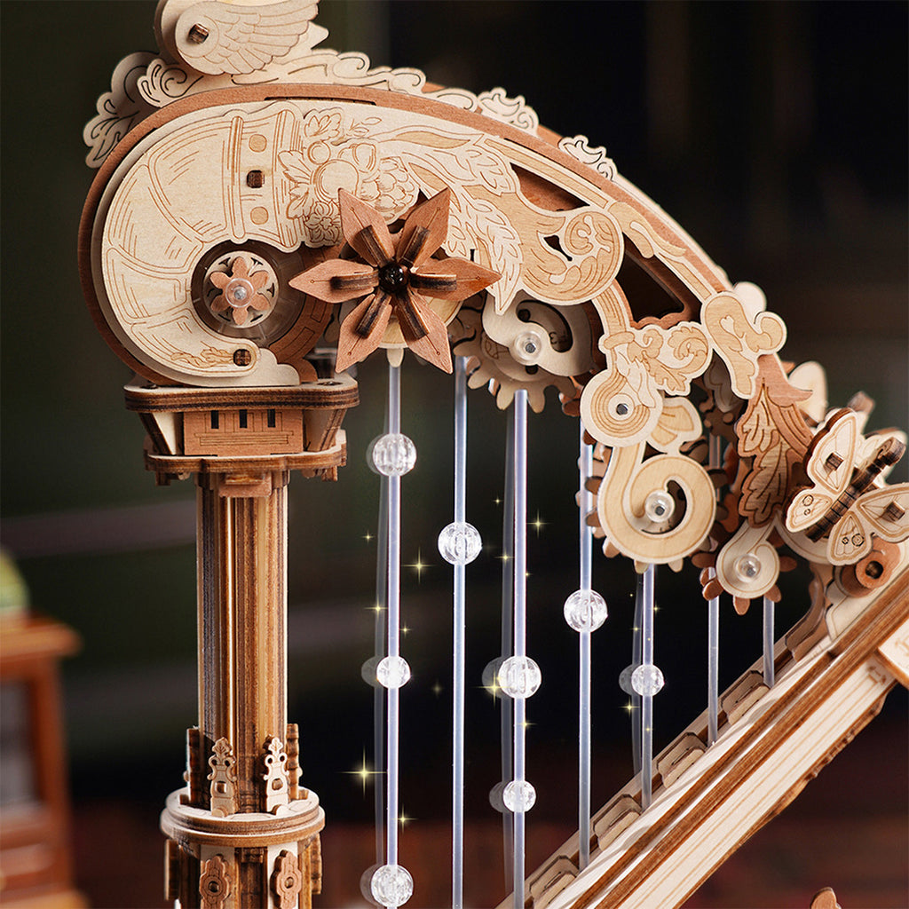 Jij brengt Franse rococo-romantiek samen met speelse techniek in deze stijlvolle harp. Deze bouwset maakt van bouwen een belevenis. Terwijl je kijkt, draaien voet en hals elegant in tegengestelde richting en blijft de bloem bovenop vrolijk rondzwieren. Intussen zorgen houten tandwielen ervoor dat de snaren met pareltjes telkens subtiel worden aangetikt, een mechanisch ritme dat de harp laat stralen. Het voelt bijna alsof je een kunstwerk tot leven wekt, een mix van decoratie en fun die perfect past bij jou, die houdt van iets unieks!