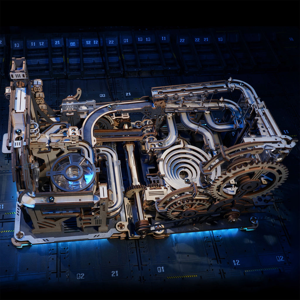 En niet alleen maakt Robotime ze aan elkaar vast zodat de knikkers kunnen rollen van de een naar de ander, maar ook ga je automatiseren en verlichten! Want behalve nieuwe tracks die oversteken tussen de knikkerbanen, krijg je met dit verbindingspakket ook een printplaat. Daarop kun je een ledsnoer aansluiten dat blauw licht geeft dat je onder in de knikkerbanen inbouwt. Maar ook kun je een USB-kabel aansluiten om de aandrijving automatisch te laten gaan. Je hoeft dan niet meer de hendels rond te draaien.