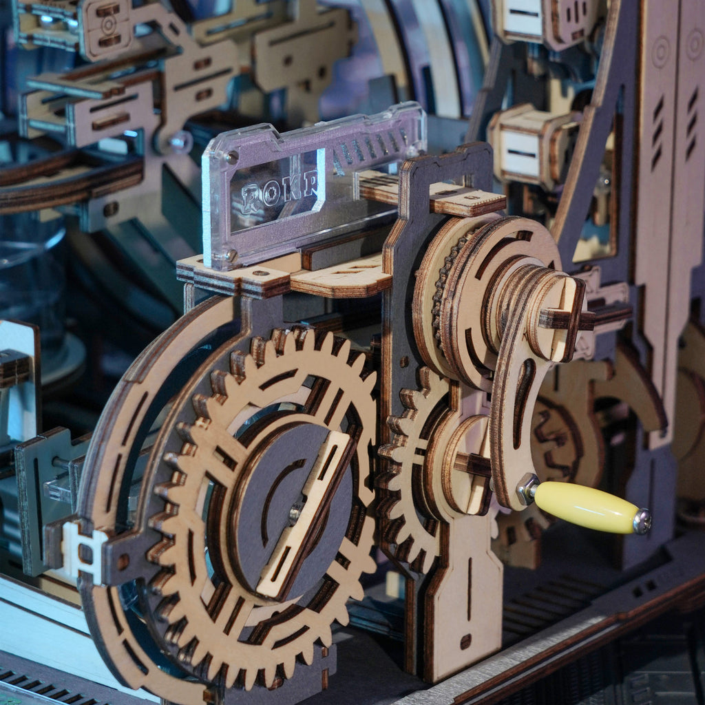 Voor je ligt een doos met 472 puzzelstukken, allemaal gemaakt van duurzaam hout en kunststof. Met het uitdrukken van de elementen met je vingers en met een kniptang begin je je reis naar het creëren van dit meesterwerk. Je hoeft geen lijm te gebruiken, want de onderdelen passen perfect in elkaar dankzij de lasertechniek met pen-en-gatverbindingen. En als hij dan klaar is … Zo gaaf om dan de tandwielen naadloos te zien samenwerk en de kogeltjes hun weg te zien vinden door de talloze mogelijkheden. Erg handig is de USB-aansluiting waarmee je hem kunt automatiseren.