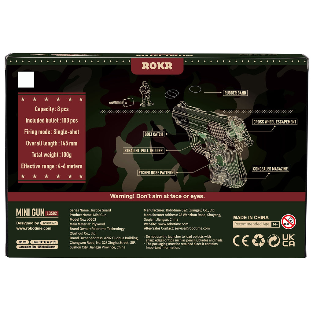 Effectief, dit is nu eens een blikvanger! Het ontwerp van deze mini-revolver, de Romantic Shooter, steekt er echt bovenuit met z’n verfijnde details. Je hebt zelfs een schone roos aan de zijkant van de handgreep, wat hem een schattige touch geeft. En de twee kleuren hout, maken je pistooltje gewoon trendy! ROKR heeft hier met véél liefde gewerkt aan een perfecte mix van techniek en stijl. En als je klaar bent met bouwen, kan je schieten! Tot 8 keer achter elkaar de trekker overhalen, ideaal voor een portie creatief plezier!