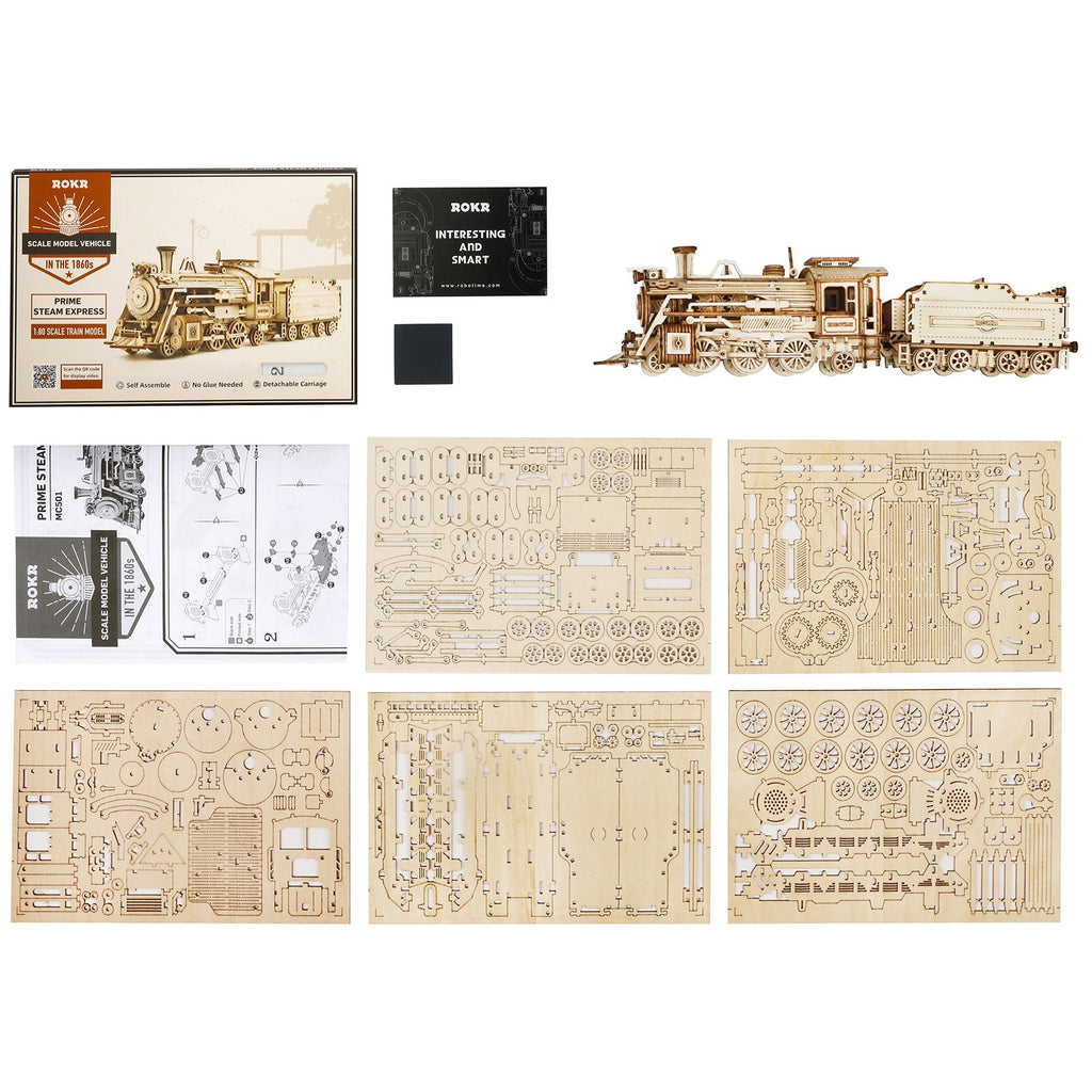 Heb je wel eens nagedacht over duurzame modelbouw? Dat zijn bouwpakketten waar geen lijm aan te pas komt, zo min mogelijk plastic is gebruikt en geen batterijen in verwerkt zijn. ROKR van Robotime maakt doordachte bouwsets die gemaakt zijn van milieuvriendelijke materialen. Hout behoort tot de vernieuwbare energie, vriendelijker kan het niet. Jouw nieuwe stoomtrein is daarom een houten 3D-puzzel. En wat voor een stoomtrein! Jouw statische model is schitterend gedetailleerd met loskoppelbare kolenwagen waarvan de klep open kan. De grote stoomketel heeft voorop de sneeuwschuiver of bullbar. Hij heeft een echt aangebouwde vuurkist, natuurlijk de stoomfluit en gedetailleerde aandrijfstangen met schaarmechanisme. Je ziet zo de stoker en machinist samenwerken op jouw trein!