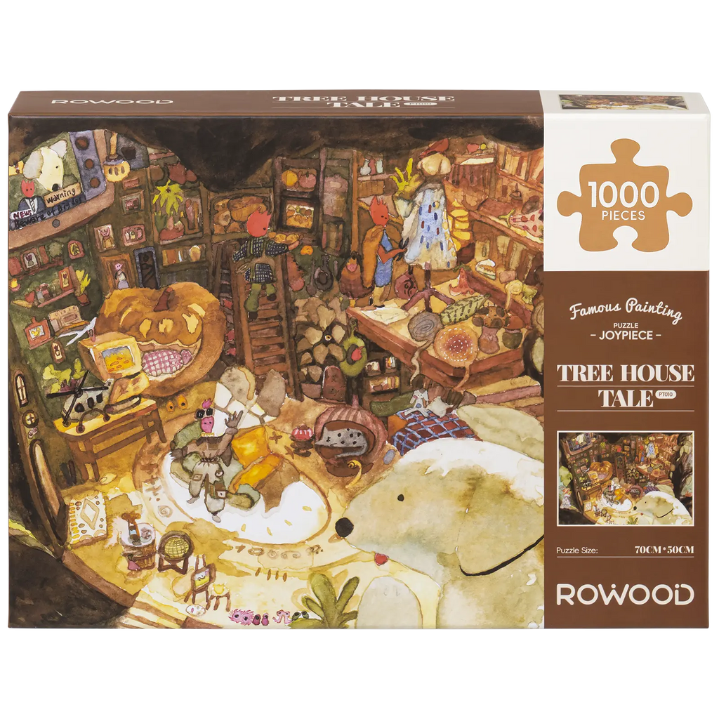 De Tree House Tale puzzel daagt je uit om deze sprookjesachtige wereld puzzelstukje voor puzzelstukje op te bouwen. Met 1000 stevige Rowood-puzzelstukjes van karton, voornamelijk in warmbruine waterverftinten, is het een combinatie van uitdaging en ontspanning. De puzzel is ontworpen om gedetailleerd en overzichtelijk te leggen, bijvoorbeeld door de bedrukte achterzijde, waardoor je elk element, van de ladder tot de pompoen en de goudstukken, tot leven brengt. Verwacht ongeveer 10 uur puzzelplezier, waarbij elk stuk perfect past en je stap voor stap dichter bij het betoverende geheel komt.
