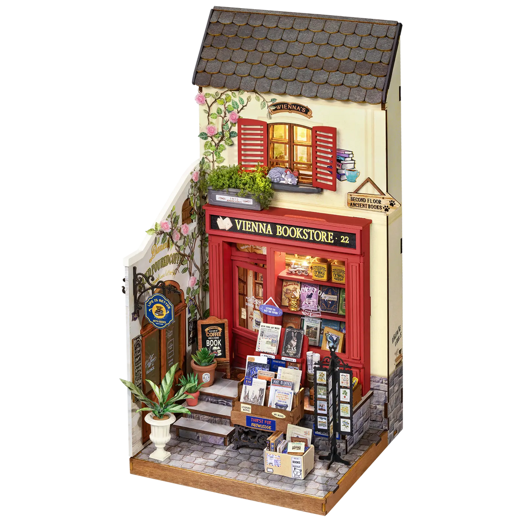 Het houten bouwpakket Vienna Bookstore brengt retro charme in je collectie! Dit miniatuurhuisje heeft een bruinrode gevel met luiken bij de bovenramen. Een paar stapjes leiden naar de boekenwinkel, waar boeken uitgestald staan in dozen op de stoep. Klimplanten met rozen maken het tafereel extra levendig en romantisch. Dit houten bouwpakket ademt ontzettend veel gezelligheid, detail en vintage sfeer uit, perfect voor iedereen die houdt van miniatuurhuisjes met karakter en een nostalgische uitstraling. Het is een fraaie eyecatcher die direct sfeer toevoegt aan je creatieve verzameling.
