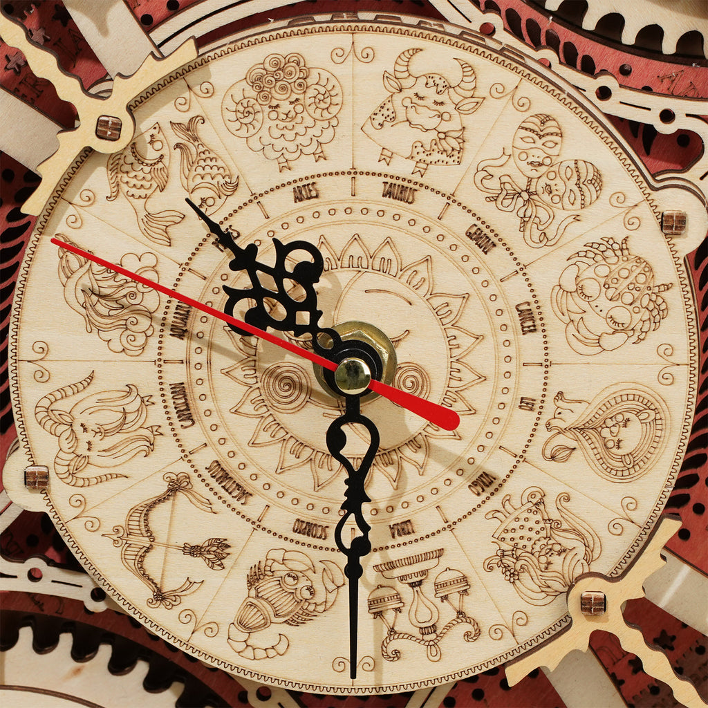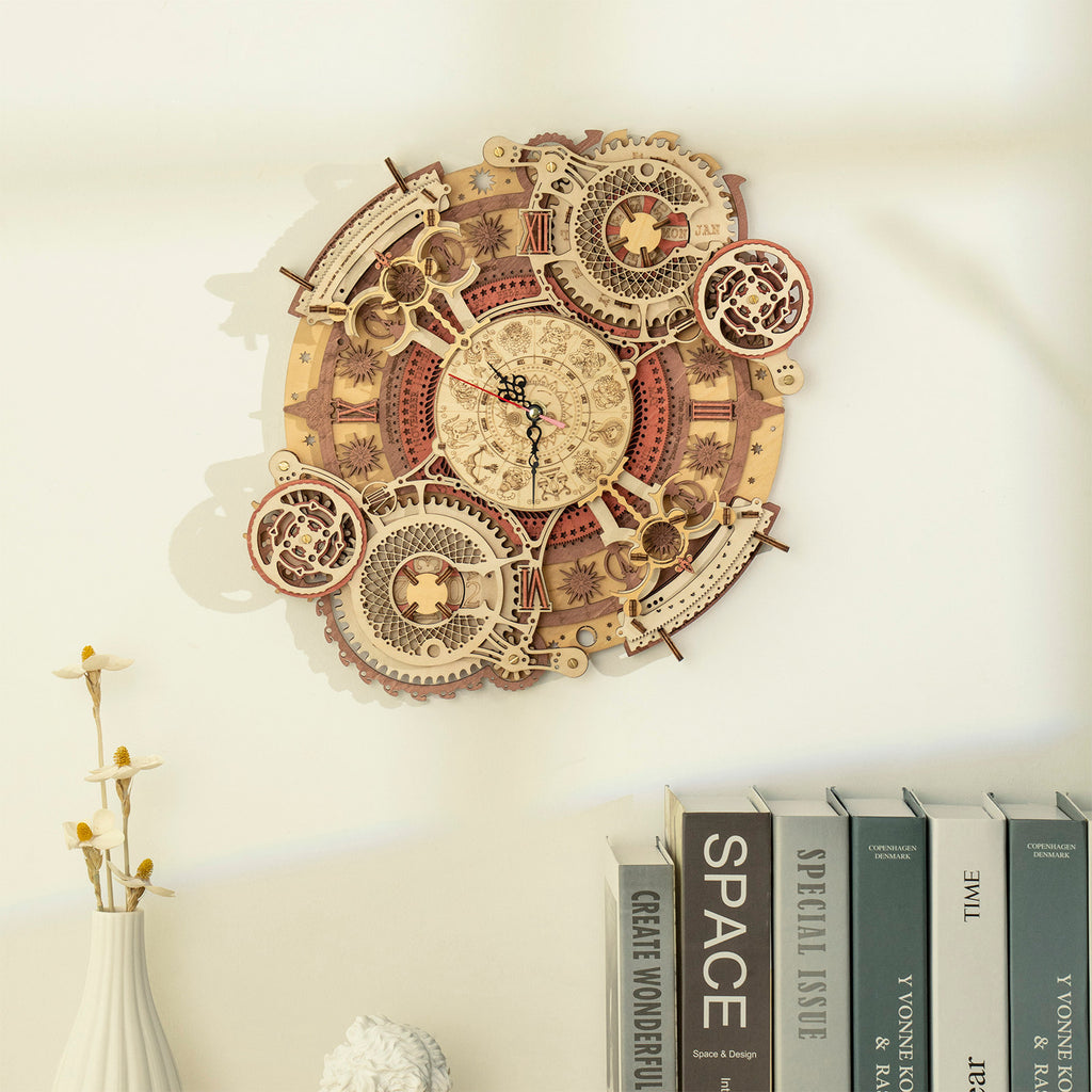 Wauw, steampunk op en top! Dit is weer zo'n gaaf houten ROKR-bouwpakket van Robotime! Dit keer hebben we de barokke 'Zodiac muurklok' voor jou ontworpen. Zoals de naam al aangeeft, staan de tekens van de dierenriem afgebeeld op deze DIY-klok. Met tijdloze kunst bedoelen we uiteraard niet dat het uurwerk geen tijd aangeeft, want dat werkt juist met quartz-precisie. De datum, de maand en het zodiacteken draai je zelf mechanisch met de hand. Het leuke van de looks van deze klok? Hij heeft zowel stoere tandwielen, als fijne, bijna kantachtige filigraandetails. Daarbij heeft deze klok zachte kleuren, wat hem echt tot een perfecte muurdecoratie maakt.